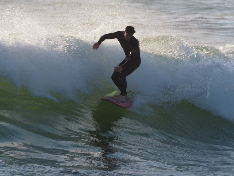 Many surfers at Rivermouth. Despite it being twilight, and shark risk conditions, there were many surfers riding the short but fiery waves.